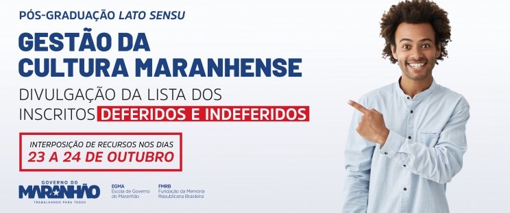 A Escola de Governo do Maranhão (Egma) divulgou, nesta sexta-feira (20), o resultado parcial das inscrições dos discentes para o processo seletivo da Pós-graduação (Lato Sensu) em Gestão da Cultura Maranhense. Para ter acesso ao resultado parcial, basta acessar o site o site egma.ma.gov.br. O prazo para recurso é de 23/10 a 24/10/2023 por meio do endereço: https://forms.gle/CVYChMoGjUWvLezb6