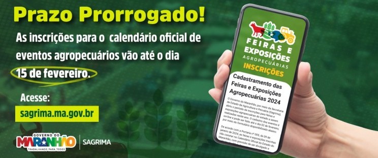 O Governo do Maranhão, por meio da Secretaria de Estado de Agricultura e Pecuária (Sagrima), prorrogou até o dia 15 de fevereiro o prazo para as inscrições das feiras e exposições agropecuárias no Calendário Oficial do Estado do Maranhão, conforme a Portaria Nº 012, de 31 de janeiro de 2024.
