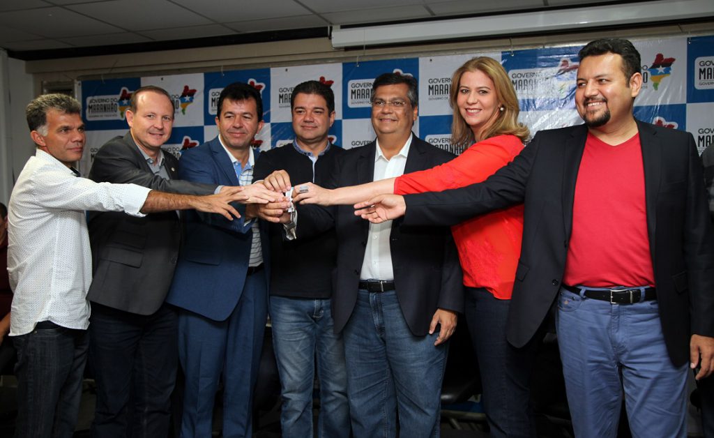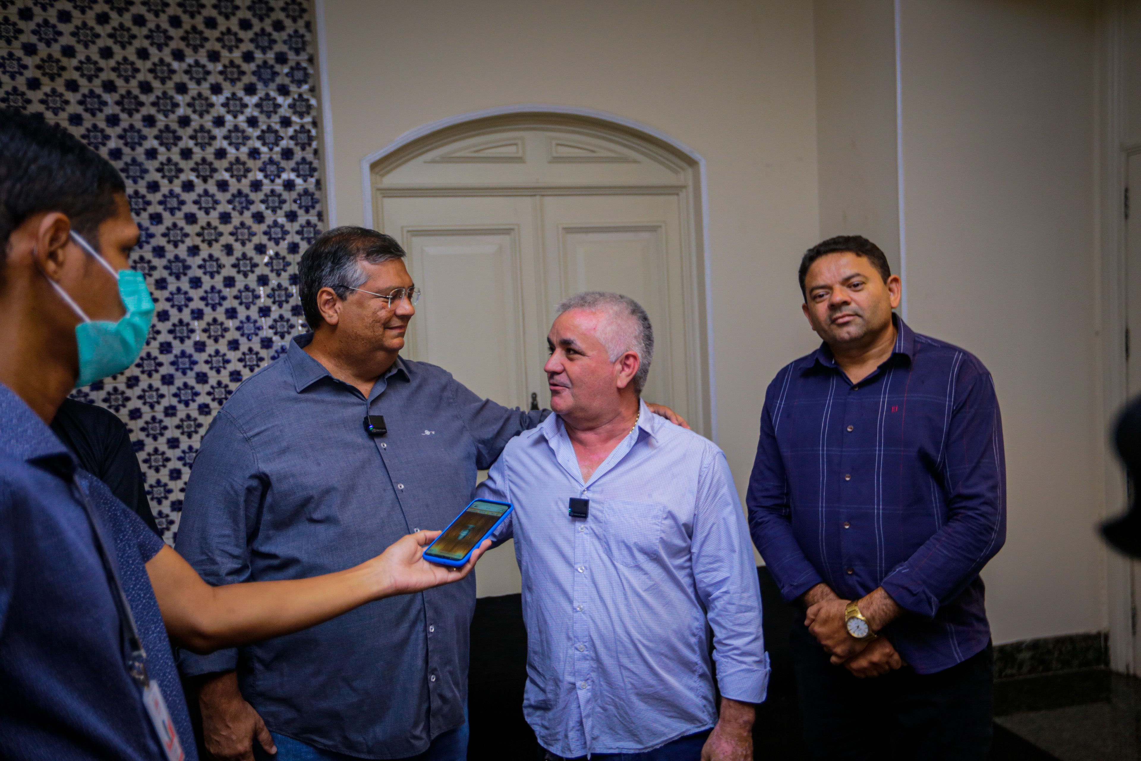 Governador Flavio Dino e secretário Clayton Noleto em solenidade de entrega de motoniveladoras em 2017 (Foto: Handson Chagas)