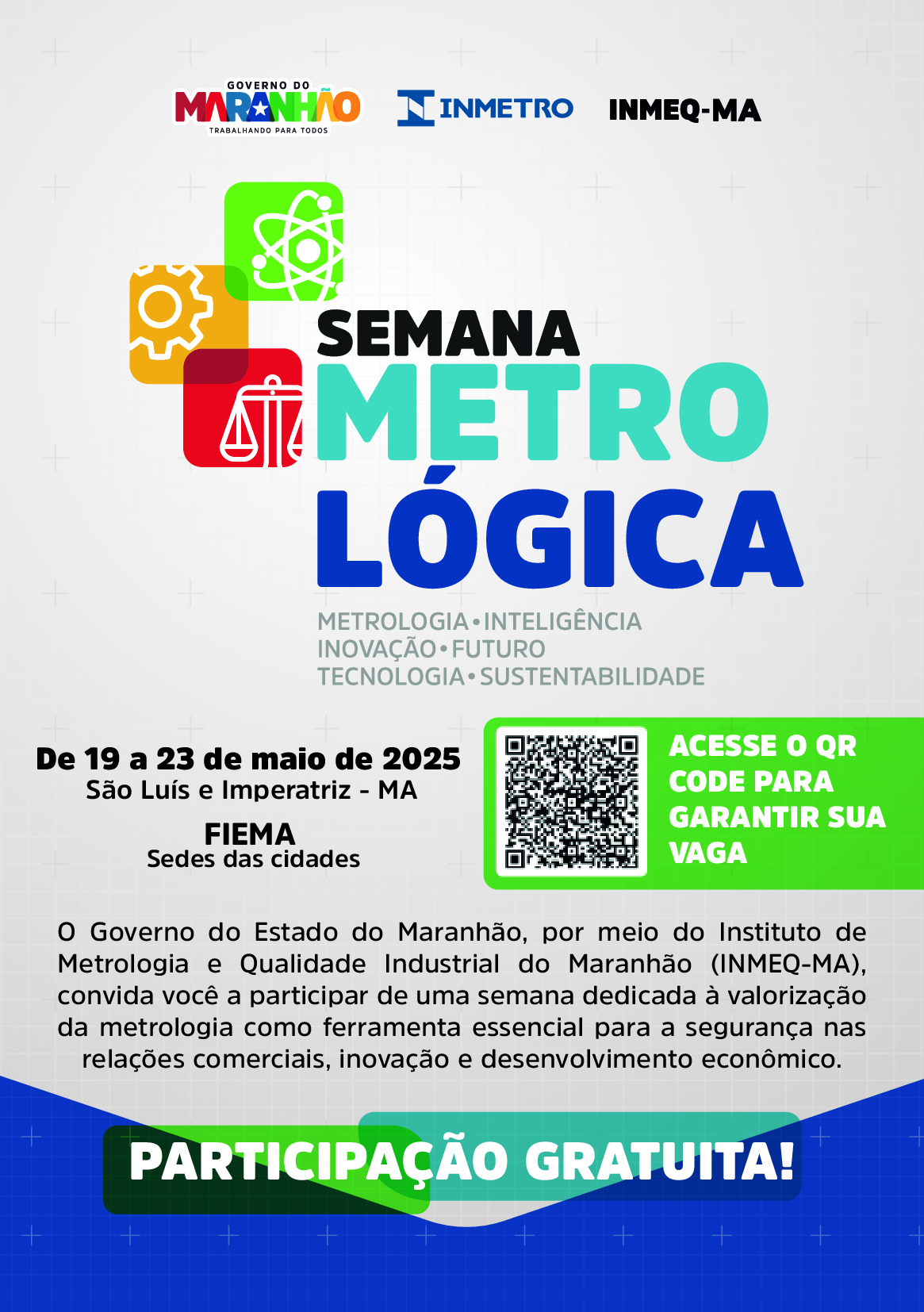 O Governo do Maranhão, por meio do Instituto de Metrologia e Qualidade Industrial do Maranhão (Inmeq-MA), promove de 19 a 23 de maio a 1ª Semana Metrológica do Maranhão, com atividades nas cidades de São Luís e Imperatriz. A ação tem como objetivo ampliar o debate sobre a importância da metrologia nas relações de consumo, na inovação e no fortalecimento do setor produtivo.