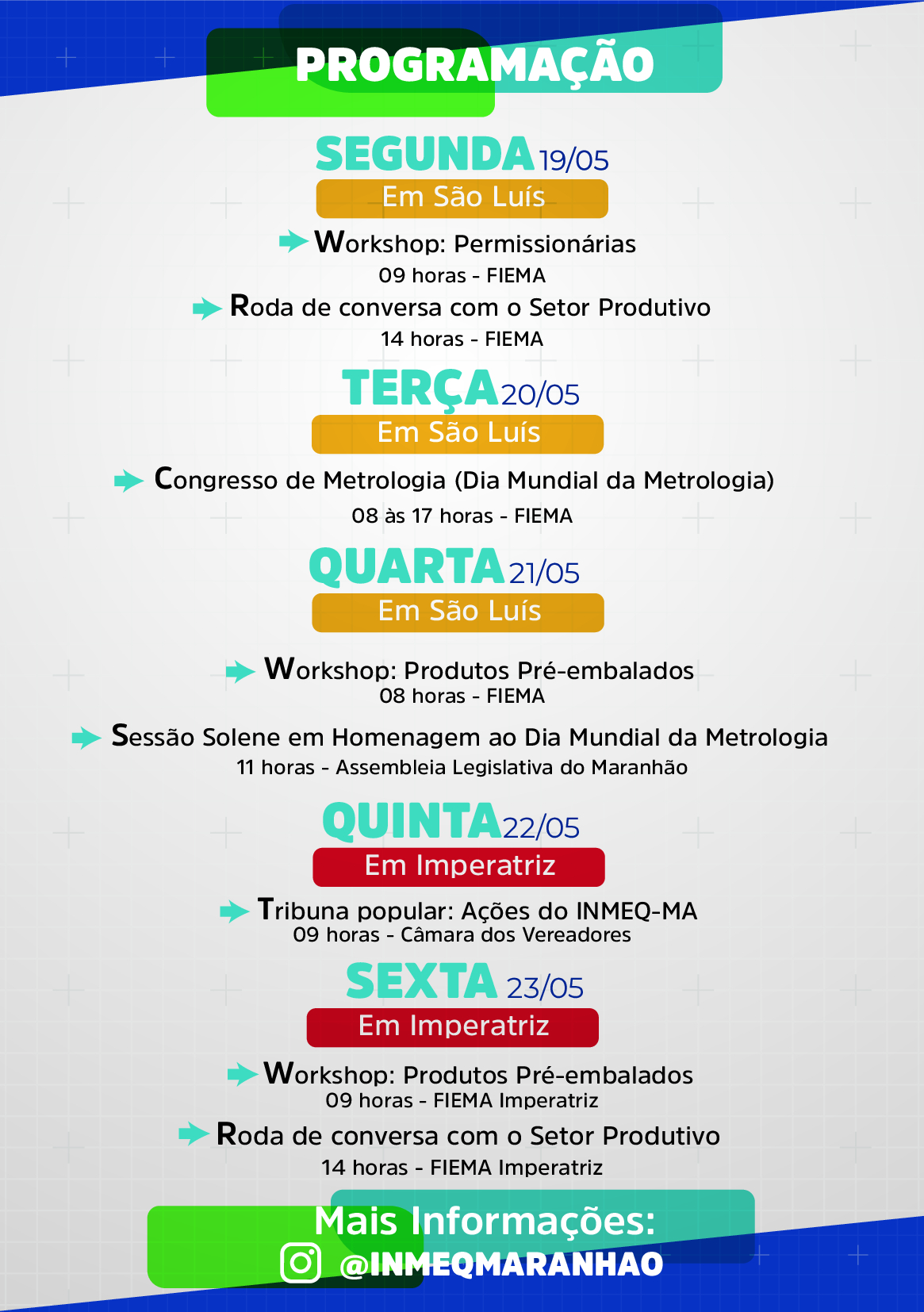 A programação inclui workshops de capacitação para empresas, rodas de conversa com empresários, uma sessão solene na Assembleia Legislativa e o Congresso de Metrologia, que será realizado no dia 20 de maio, na sede da Federação das Indústrias do Estado do Maranhão (Fiema), em São Luís. A data marca o Dia Mundial da Metrologia, celebrado em diversos países.