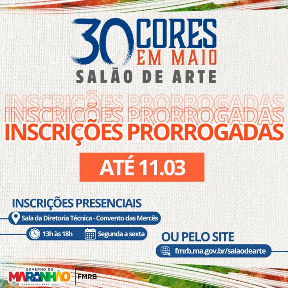 Foram prorrogadas, até o dia 11 de março, as inscrições para a exposição “30 cores em Maio - Salão de Arte”, no Convento das Mercês. Promovida pelo Governo do Maranhão, por meio da Fundação da Memória Republicana Brasileira (FMRB), a mostra de artes visuais de temática livre, concede premiação para artistas do Maranhão, proposta pela FMRB.