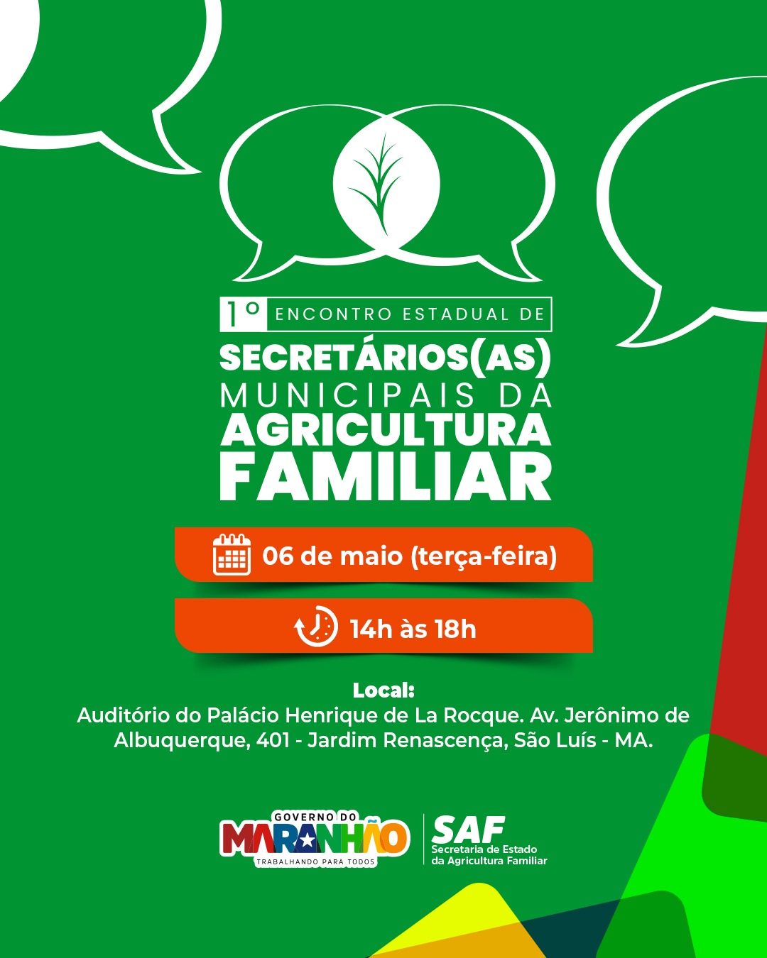 O Governo do Maranhão, por meio da Secretaria de Estado da Agricultura Familiar (SAF), realiza nesta terça-feira (6) o I Encontro Estadual de Secretários Municipais da Agricultura Familiar, que reunirá secretários e secretárias do setor para discutir e trocar experiências visando o fortalecimento e desenvolvimento rural sustentável do Maranhão.